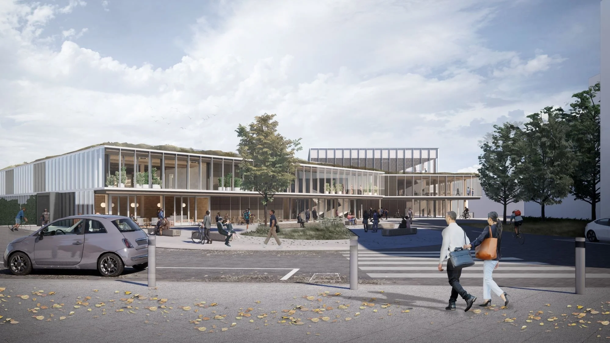 Existing structures will be re-used where possible, rejuvenating them with new green planted facades and new amenities. The low ground-scraping form maximizes opportune area for renewables